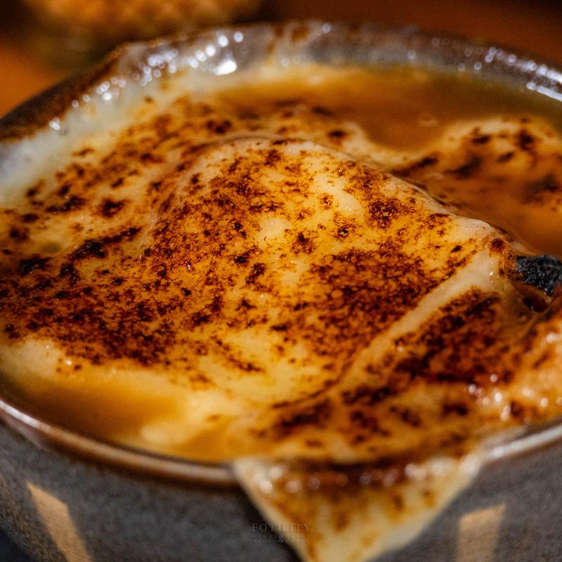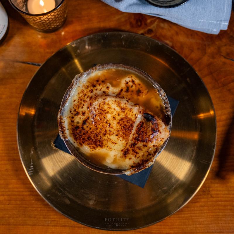 Traditional French onion soup, Comte cheese, and baguette slices.