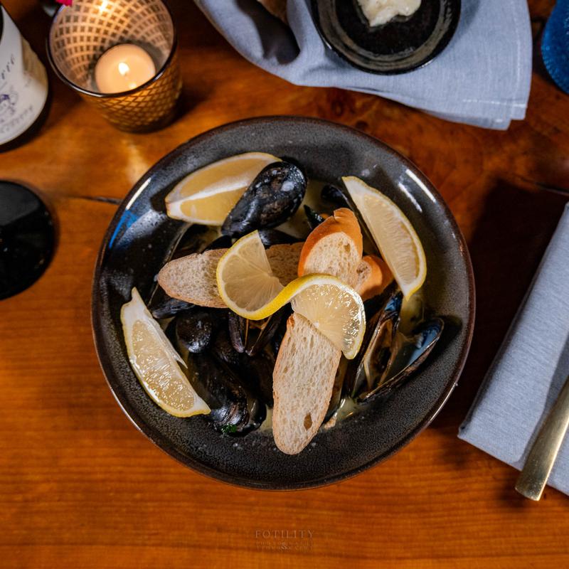 Black mussels, shallots, garlic, white wine, and herb broth.